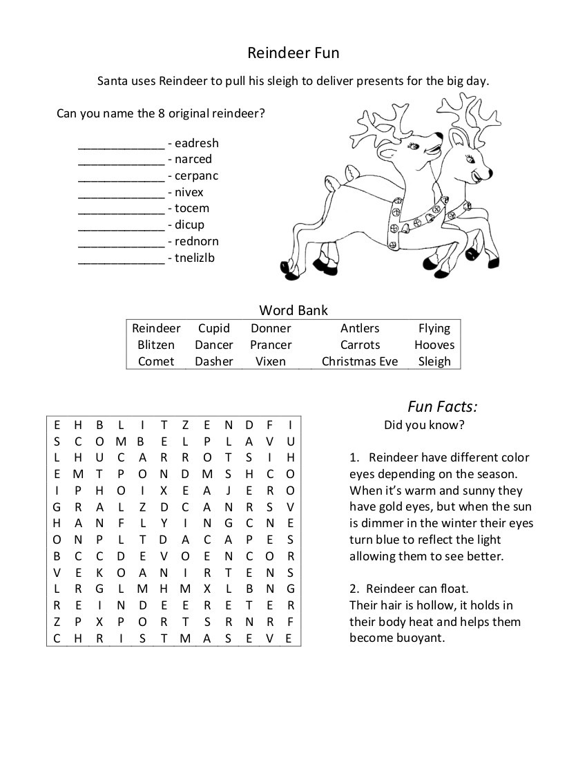 Enjoy word unscramble, word find, fun facts about reindeer and color the reindeer or add costumes to match your favorite ones.