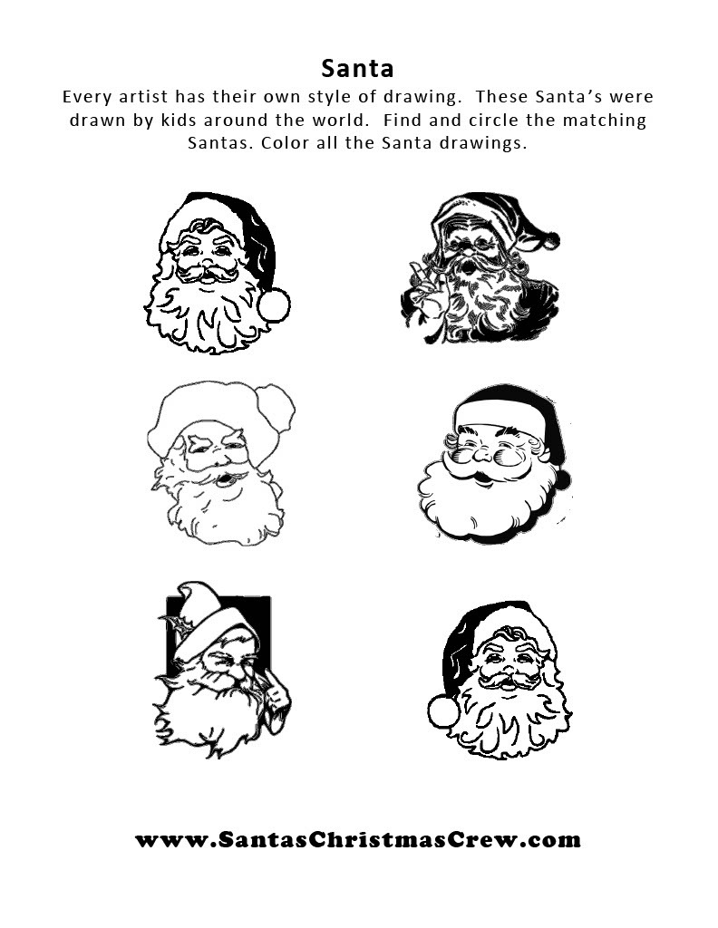 Find the matching Santas. Color them and then take a fresh sheet of paper and design your own Santa Claus.